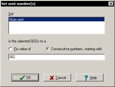If there are multiple sent numbers available, you can select the requested number first. After this you can define whether the sent numbers of the selected QSOs should be filled with a constant value or if they are consecutive numbers, beginning with a definable start-number.